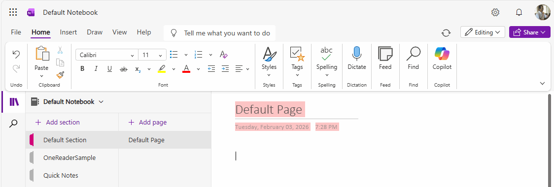 Open the Default Notebook on OneDrive.com with Web OneNote.There are already 3 sections inside.