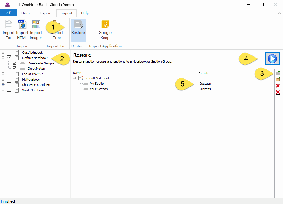 - Click the "Add Section" button on the right side to select “My Section.one” and “Your Section.one” files from your local folder. Then, the Restore list displays the generated tree structure, and the 2 .one files below the Default Notebook will become “My Section” and “Your Section” sections.
